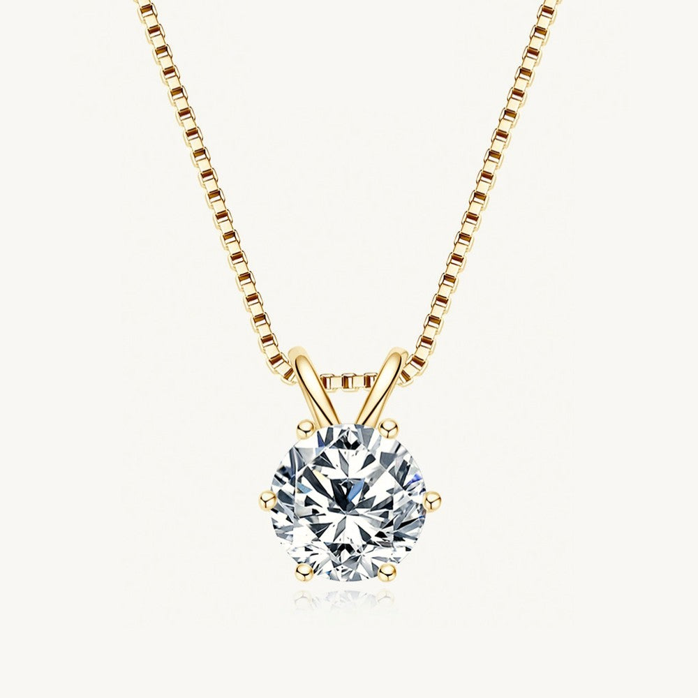 The Éclat Necklace features a round-cut moissanite set in a timeless 6-prong solitaire design — refined, radiant, and endlessly versatile. Suspended from a polished box chain, it delivers clean symmetry and lasting brilliance in a silhouette you’ll reach for every day.