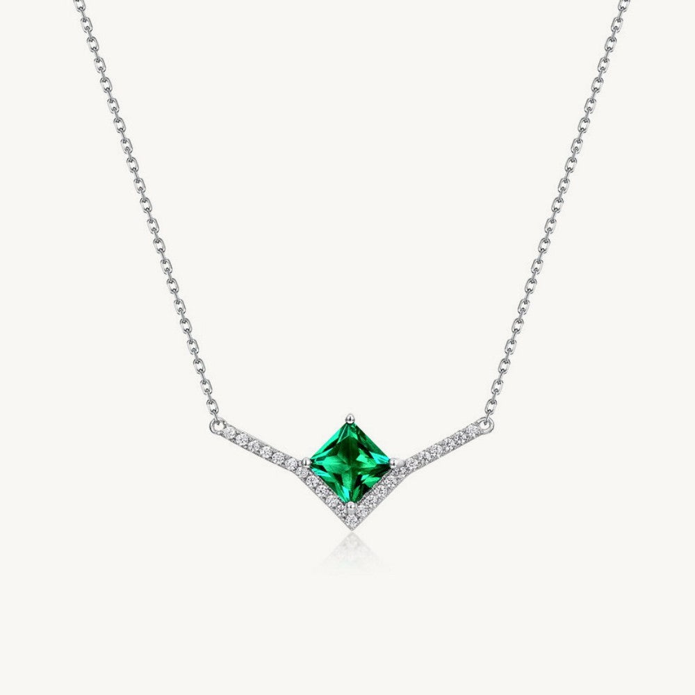 The Chevron Emerald Necklace features a striking lab-grown emerald set within a pavé-lined V-shaped frame — a clean, modern silhouette that draws the eye and flatters the neckline. The sharp geometry of the chevron contrasts beautifully with the rich green center, symbolizing balance, growth, and quiet confidence.
