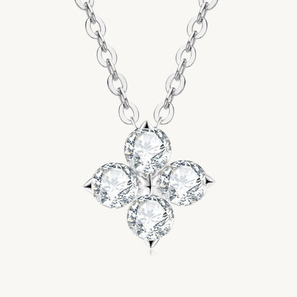 The Clover Necklace features four brilliant moissanites set in a polished clover-shaped design — balanced, dimensional, and full of light. Each stone is secured by sleek prongs, forming a soft geometric motif that feels both playful and poised.