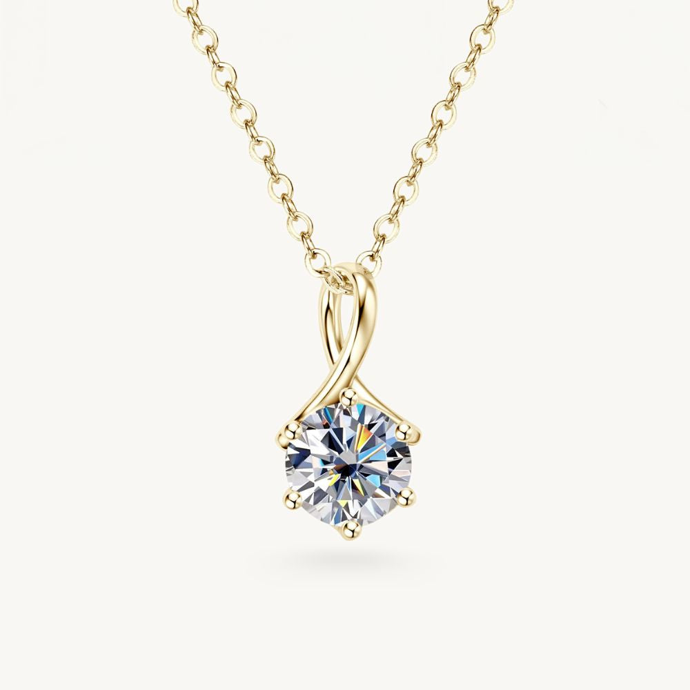 The Allure Moissanite Necklace features a 1-carat round-cut Moissanite — precision-set beneath an elegant crisscross bail that flows seamlessly into a fine chain. Crafted to mirror the brilliance and fire of a natural diamond, the Moissanite center offers elevated sparkle with lasting clarity.
