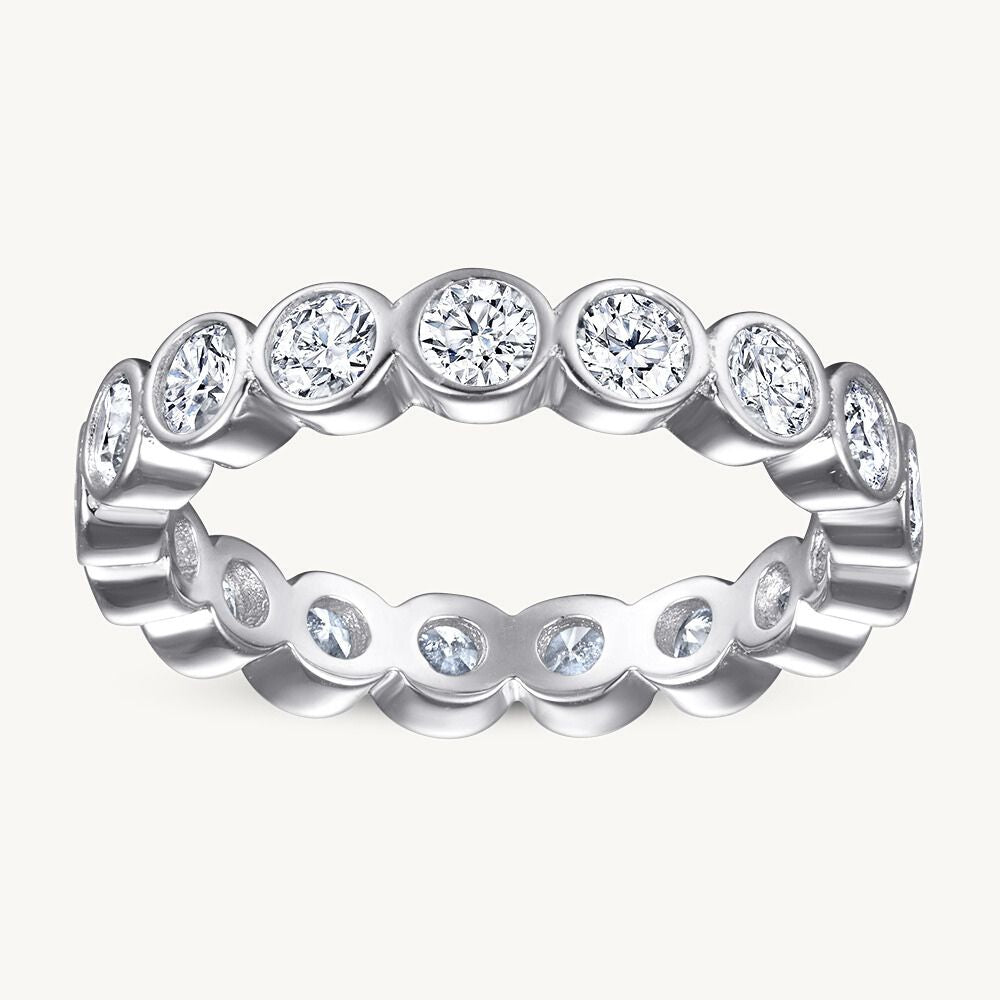 A fresh take on forever. The Cherish reimagines the classic eternity band with individually bezeled simulated diamonds that create a stunning bubble effect around your finger. The secure bezel settings protect your stones better than traditional prongs, embracing each one like something cherished.