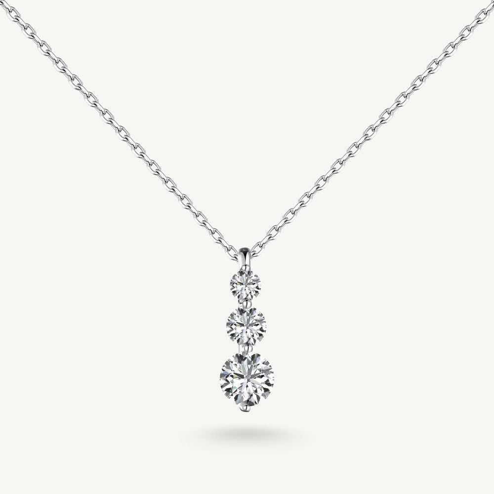 The Crescendo Necklace features three round-cut simulated diamonds arranged in a delicate vertical cascade — each stone slightly larger than the last, building to a soft, elegant finish. With a total of 1.2 carats, this pendant offers just enough brilliance to feel special, yet wearable for every day.