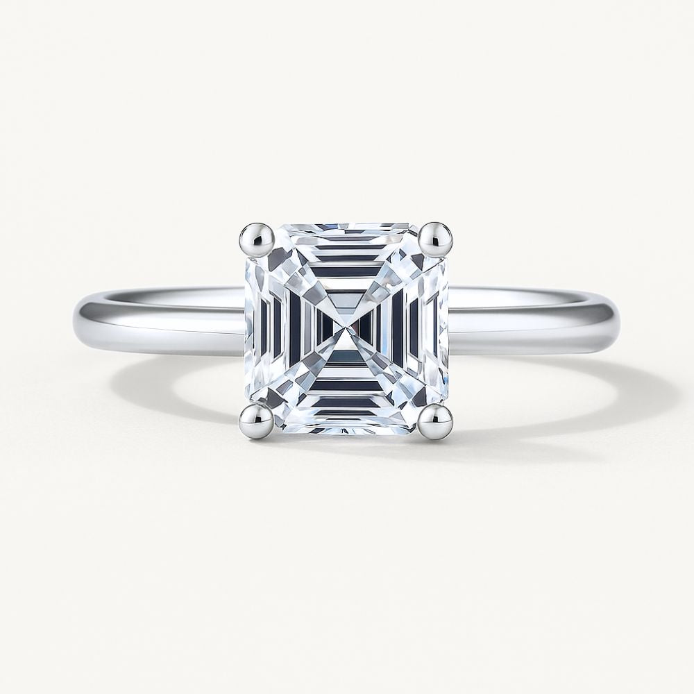 This Asscher cut solitaire features a 1.25 carat stone with deeply layered step cuts that reflect light in a calm, mirror-like rhythm. Held in a clean four-prong setting on a polished band, it’s a quietly bold choice for the modern minimalist. Sleek on its own or stacked with bands, The Échelon Ring is made for those who appreciate structure, clarity, and understated power.