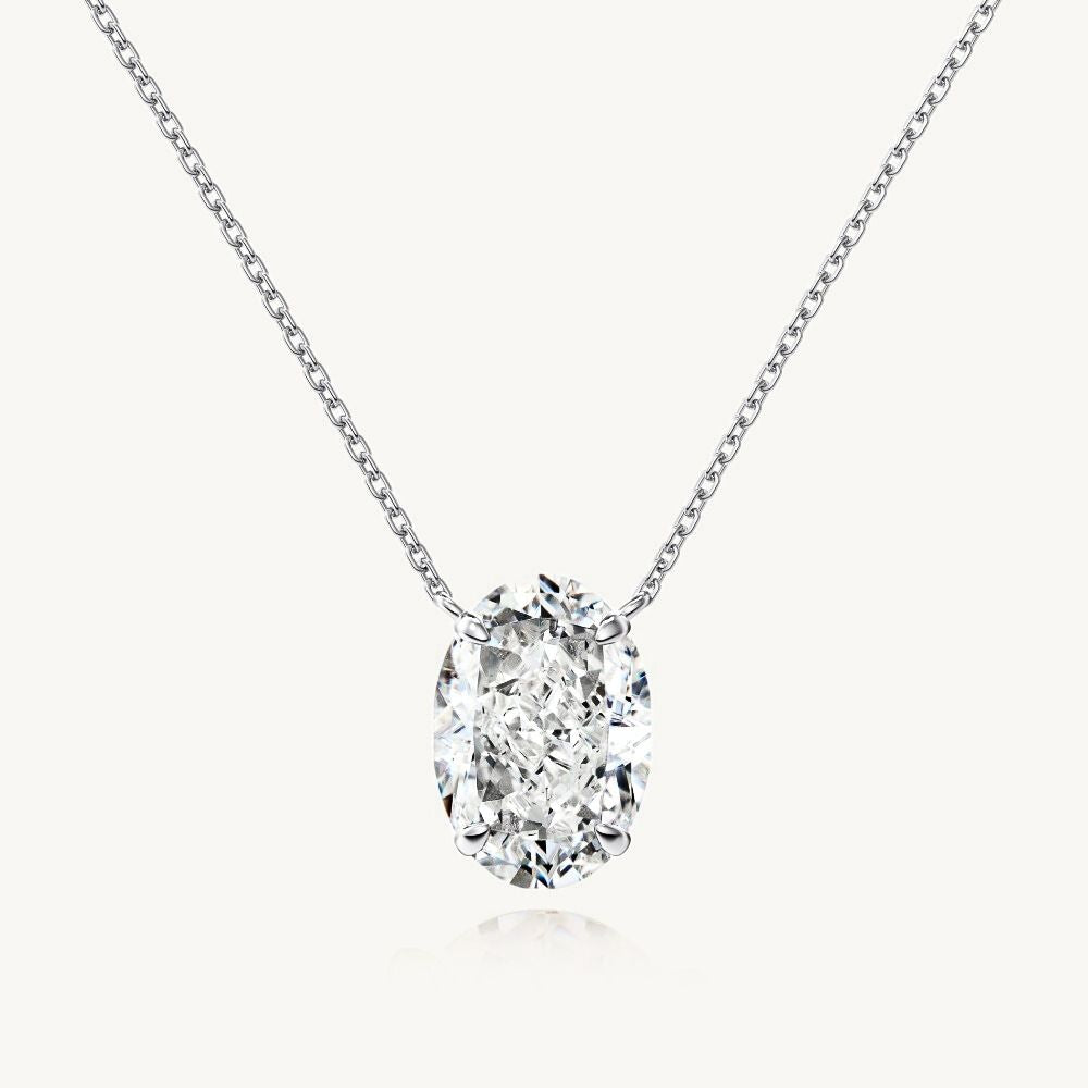 The Odette features a brilliant oval-cut simulated diamond in your choice of 1.5 or 4 carats, suspended in a delicate floating setting that creates the illusion of light dancing across your skin. Available in both yellow gold and platinum finishes, this necklace brings just the right balance of subtlety and statement.