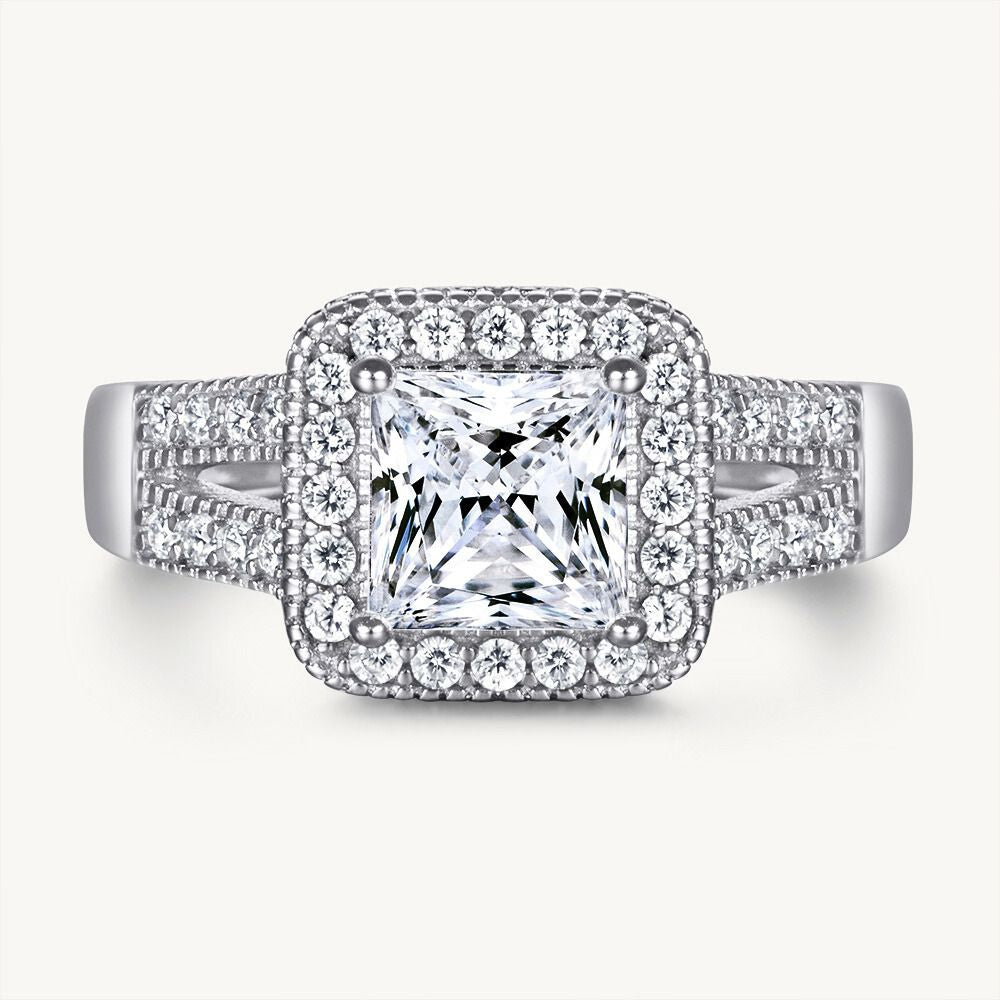 With a 1.25 carat princess-cut center framed by a halo and intricate milgrain edges, The Regent Ring exudes timeless grandeur. A hidden side halo glows beneath the surface, catching light from every angle, while the pave-encrusted split shank band adds graceful brilliance and texture — blending heirloom beauty with modern craftsmanship.