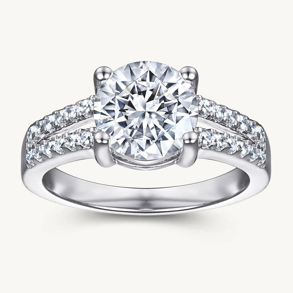A modern silhouette that doesn’t compromise on brilliance. The Verge Ring features a 2-carat round center stone elevated by a refined split shank band, drawing the eye inward with fluid symmetry. Clean lines and double rows of pavé stones create dimension without distraction — making this a statement of balance, elegance, and effortless sparkle from every angle.